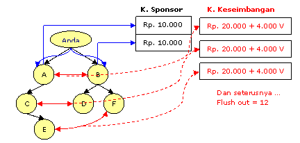 Komisi Pasangan / Keseimbangan : Anda akan mendapat Rp. 20.000 Cash, ditambah Rp. 4.000 Nilai Pulsa isi ulang telp prabayar anda setiap terjadi satu (1) keseimbangan jumlah di jaringan sebelah kiri dan kanan Anda.